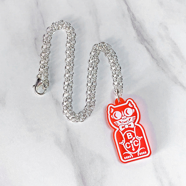 A semi-translucent acrylic charm, in frosted chilli red, on a silver plated cable link chain with a lobster clasp fastening.
